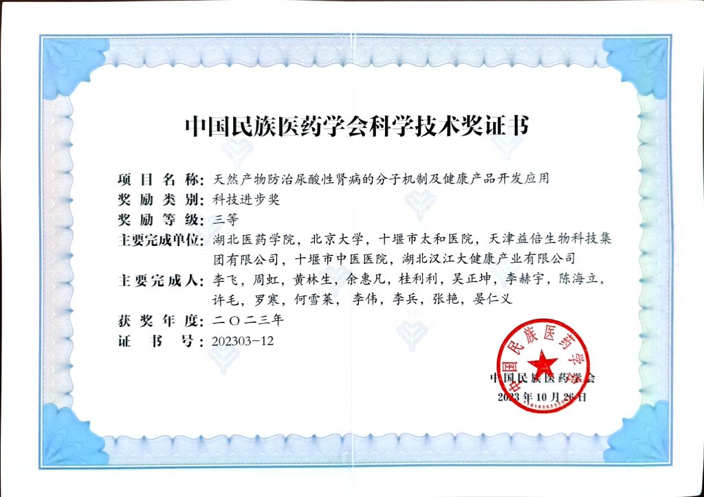 本网讯(通讯员 余惠凡)近日,中国民族医药学会发布《关于2023年度中国民族医药学会科学技术奖的奖励决定》(中民医药会科〔2023〕129号文件,公布2023年中国民族医药学会科学技术奖评选结果,李飞教授团队主持的成果《天然产物防治尿酸性肾病的分子机制及健康产品开发应用》获三等奖。