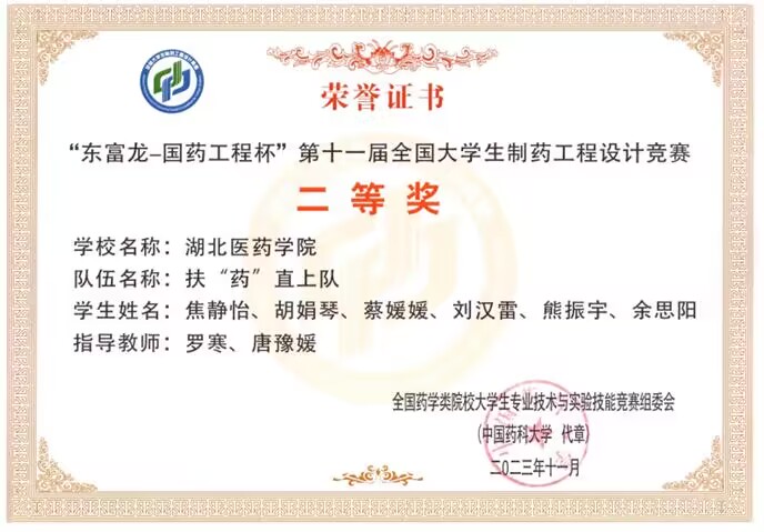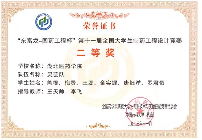 本网讯(通讯员 罗寒 焦静怡)近日,从全国药学类院校大学生专业技术与实验技能竞赛组委会传来喜报,我校药学院王天帅、李飞老师指导的“灵芸队”和罗寒、唐豫媛老师指导的“扶‘药‘直上队”在东富龙-国药工程杯”第十一届全国大学生制药工程设计竞赛全国总决赛中,荣获全国二等奖的好成绩。