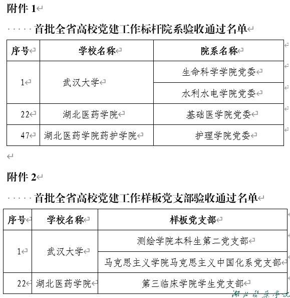 本网讯(通讯员 赵峥)近日,湖北省委教育工委发布《省委教育工委关于公布首批全省高校基层党建示范创建工作验收通过名单的通知》,我校基础医学院分党委、药护学院护理学院分党委、第三临床学院学生党支部分别通过全省高校党建工作“标杆院系”和“样板支部”创建验收。