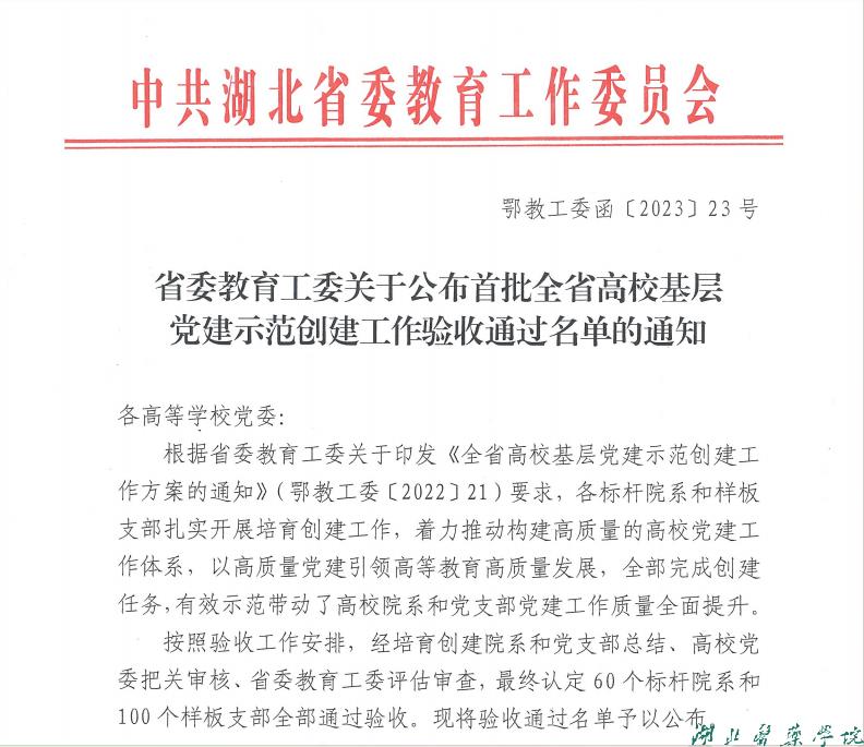 本网讯(通讯员 赵峥)近日,湖北省委教育工委发布《省委教育工委关于公布首批全省高校基层党建示范创建工作验收通过名单的通知》,我校基础医学院分党委、药护学院护理学院分党委、第三临床学院学生党支部分别通过全省高校党建工作“标杆院系”和“样板支部”创建验收。