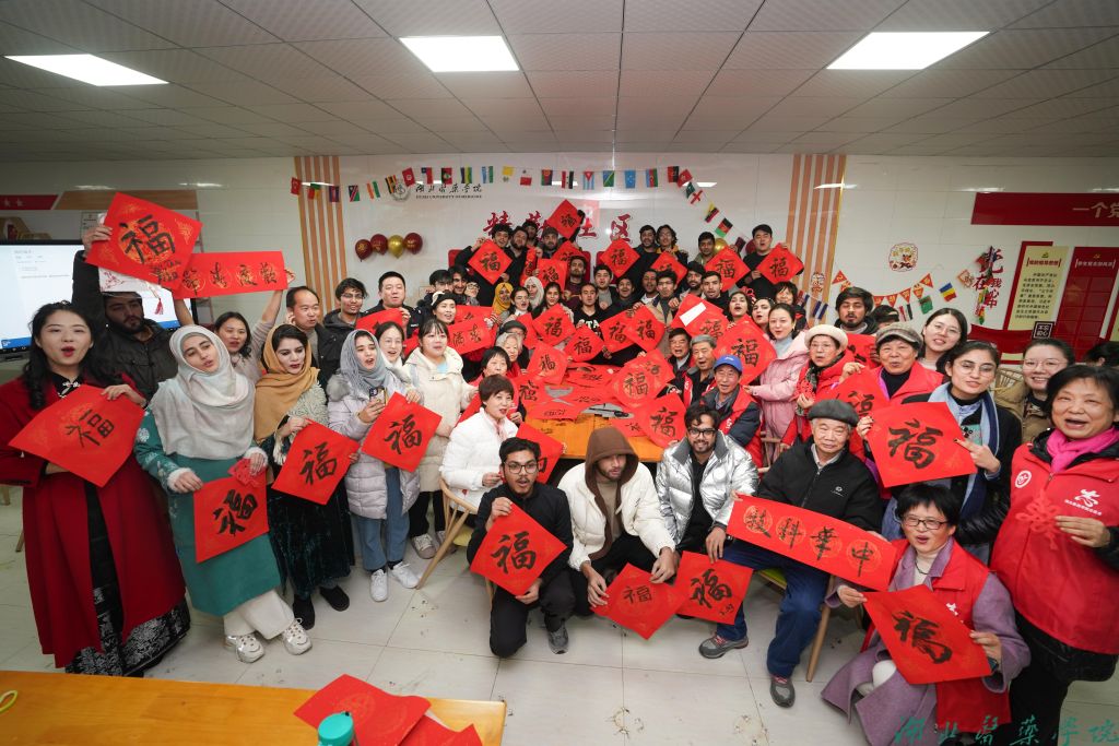 活动现场介绍了中国春节传统文化和民俗,到场留学生积极参与民俗知识问答,现场气氛热烈。活动邀请了离退休教师带领留学生写春联、送福字,把浓浓的年味和新春的祝福送到留学生中间。老教授们笔走龙蛇写得潇洒,留学生们一笔一划学得认真。留学生Laiba说:“今天我写了一个福字,福字在汉语的意思是福气、好运,希望我们新年快乐、福气多多!”