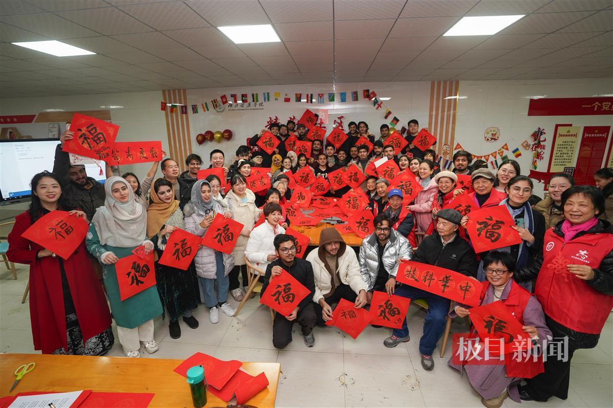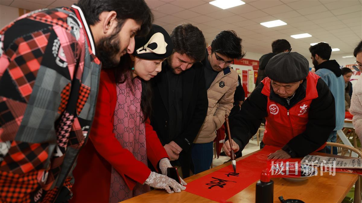 本次活动还邀请了学校的离退休教师现场带领留学生写春联、送福字,把浓浓的年味和新春的祝福送到留学生中间。老教授们笔走龙蛇写得潇洒,留学生们一笔一画学得认真。留学生Laiba说:“今天我写了一个福字,福字在汉语的意思是福气、好运,希望我们新年快乐、福气多多!”