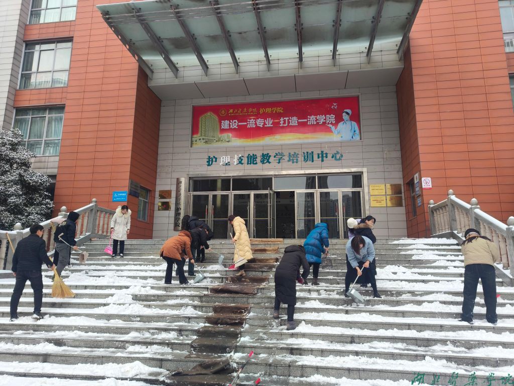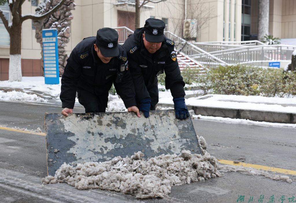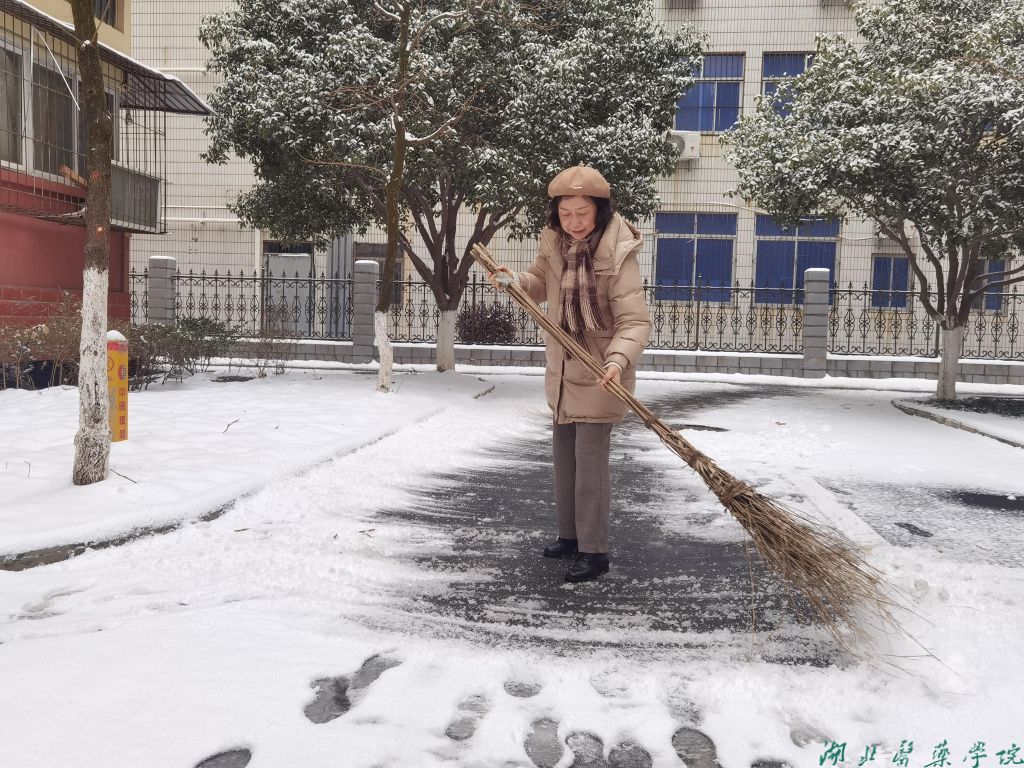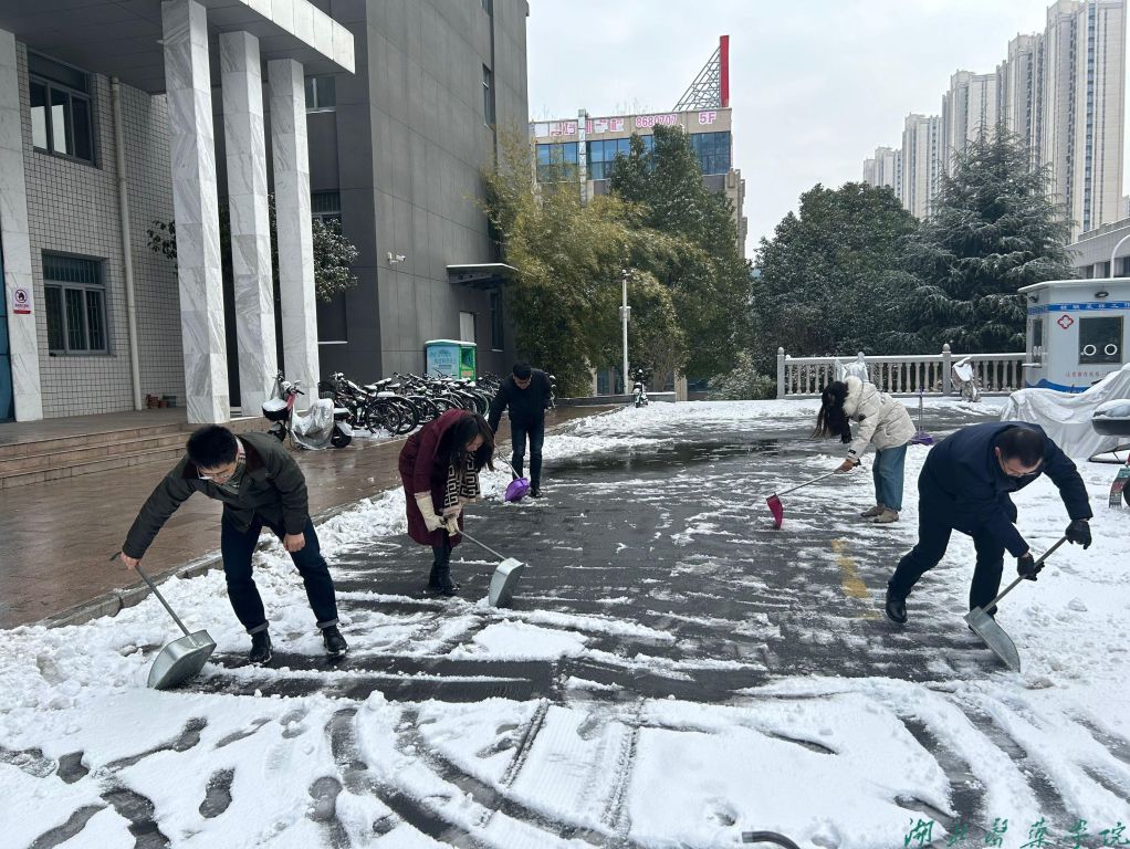 全校教职员工不惧严寒、不畏辛苦,挥动铁锹和雪铲,齐心协力、配合默契,有序清理道路积雪、铲除路面结冰,校园的各个角落都留下了教职工们忙碌的身影。经过两个小时的紧张劳动,校园主干道路积雪被全面清除。(审核 陈建龙)
