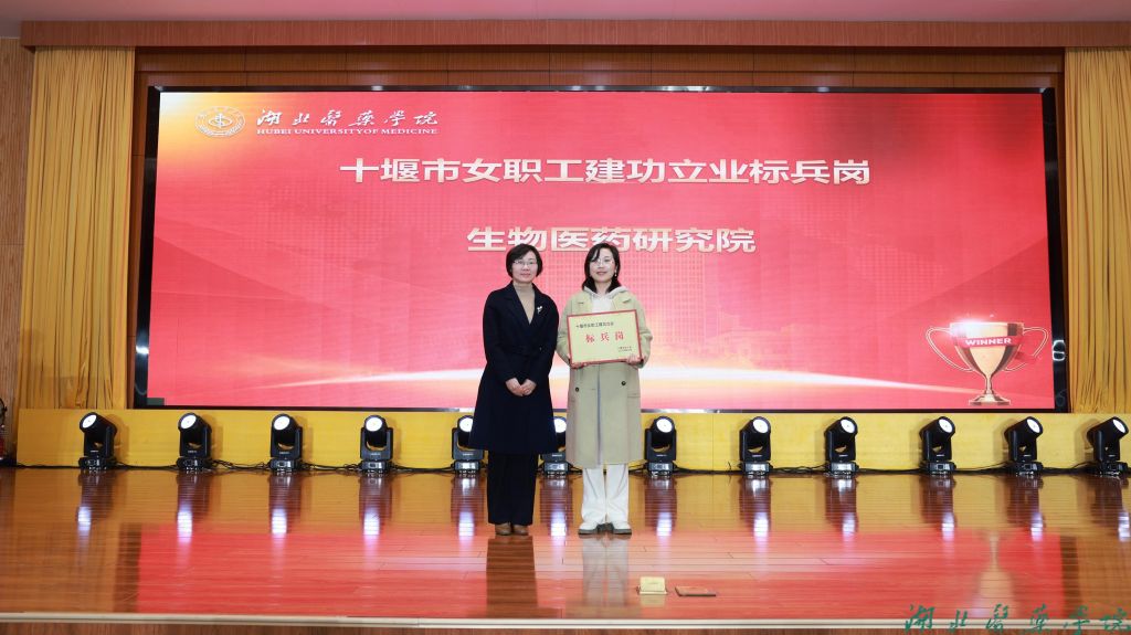 党委书记郑丹凤为获得十堰市建功立业标兵岗的生物医药研究院颁发奖牌。