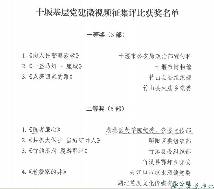 本网讯(通讯员 赵峥)近日,十堰市委组织部对2023年度全市党员教育电教片观摩评审中的获奖作品予以通报表扬。我校2部作品获奖,《医者廉心》获得2023年度十堰基层党建微视频征集评比二等奖,党课《共同缔造添活力——如何打造共建共享共治社会治理新格局》获得2023年度全市党员教育电教片评审优秀奖。