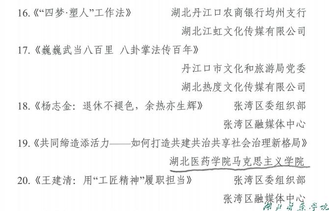 本网讯(通讯员 赵峥)近日,十堰市委组织部对2023年度全市党员教育电教片观摩评审中的获奖作品予以通报表扬。我校2部作品获奖,《医者廉心》获得2023年度十堰基层党建微视频征集评比二等奖,党课《共同缔造添活力——如何打造共建共享共治社会治理新格局》获得2023年度全市党员教育电教片评审优秀奖。