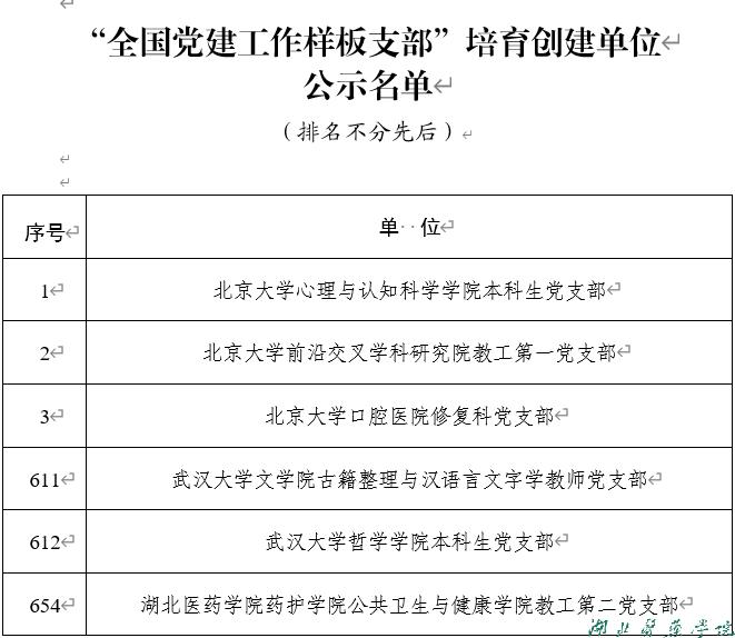 本网讯(通讯员 赵峥)3月18日,教育部公示第四批新时代高校党建示范创建和质量创优工作遴选结果,湖北医药学院药护学院公共卫生与健康学院教工第二党支部入选“全国党建工作样板支部”培育创建单位。我校全国党建工作样板支部增至5个。