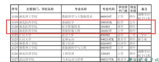 近日,教育部下发了《教育部关于公布2023年度普通高等学校本科专业备案和审批结果的通知》(教高函〔2024〕6号),湖北医药学院获批基础医学、医学影像技术、智能影像工程3个新专业,其中基础医学专业为国控专业。3个新专业将于2024年开展招生培养。