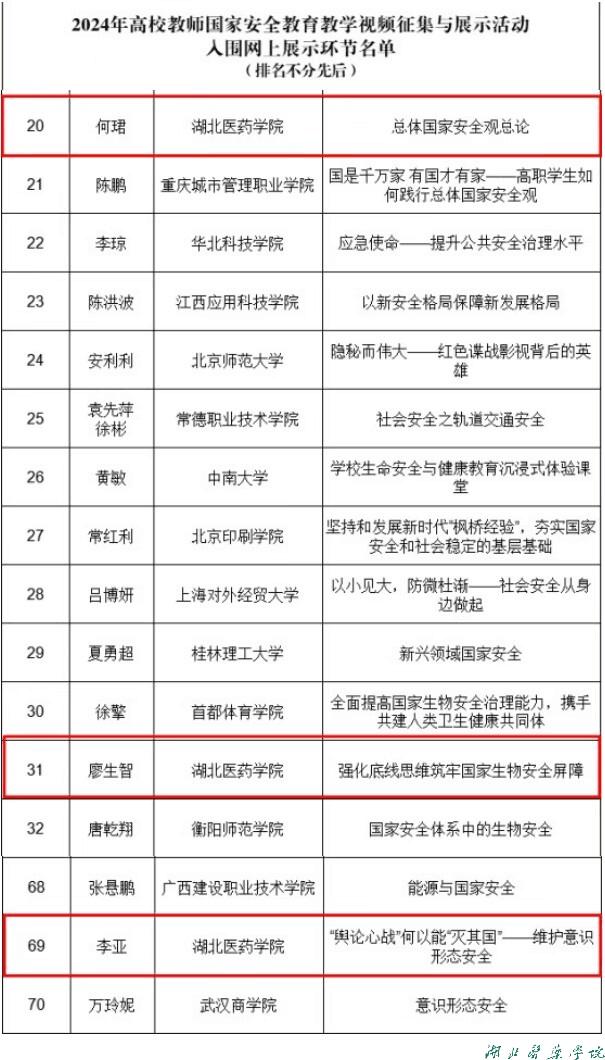 本网讯(通讯员 赵曼)在第九个全民国家安全教育日来临之际,在教育部思想政治工作司指导下,中国高等教育学会保卫学专业委员会、教育部高校思想政治工作创新发展中心联合举办2024年全国高校教师国家安全教育教学视频征集与展示活动中,我校马克思主义学院3名教师的作品经专家遴选入围优秀作品展,视频将在全国高校思想政治工作网、中国大学生在线、中国高等教育学会保卫学专业委员会微信公众号进行展示。此次教学展示活动历时一个月,我校从前期选题、教案准备、课件制作到视频录制进行了精心准备,作品在全国数百件作品中突围,顺利入围优秀作品展。