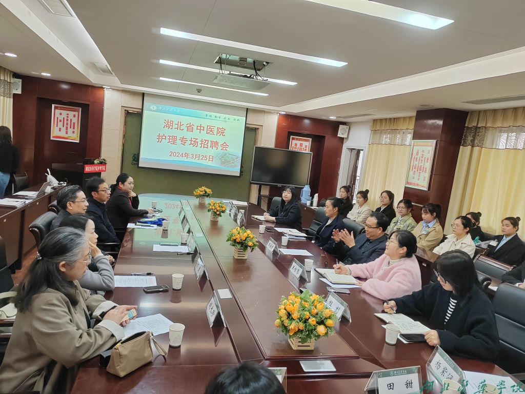 本网讯(通讯员 郭琴)3月25日上午,湖北省中医院副院长刘建忠一行来校进行护理人才专场招聘,本次专场招聘在8号楼2楼会议室进行。党委副书记、校长王云甫,党委常委、统战部部长谭艳出席招聘会前的欢迎仪式,护理学院领导班子、部分学工干部参加活动。
