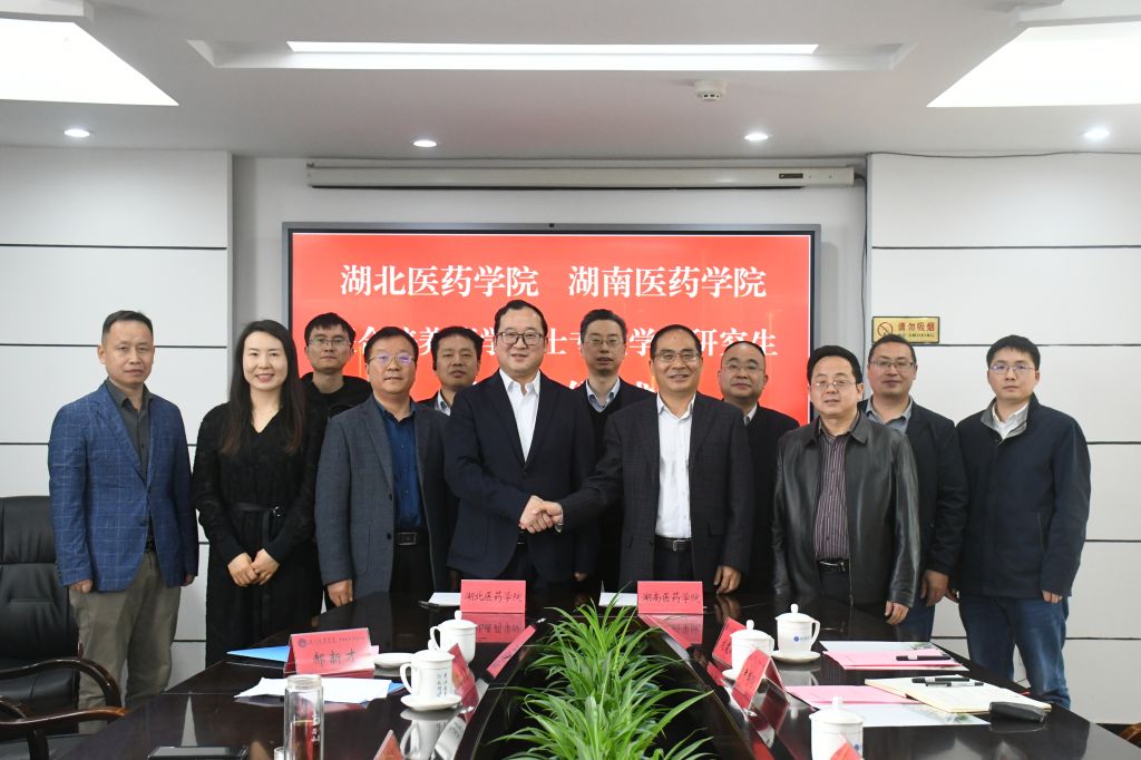 本网讯(通讯员 唐豫媛)4月8日,湖北医药学院鄂西北环境与健康产业技术研究院院长涂汉军带队前往湖南医药学院对研究生联合培养工作进行交流,湖南医药学院党委书记张在其,党委委员、副校长吴卫华以及科技处、药学院等负责人参加交流座谈会,并在会上签署联合培养药学硕士专业学位研究生协议。