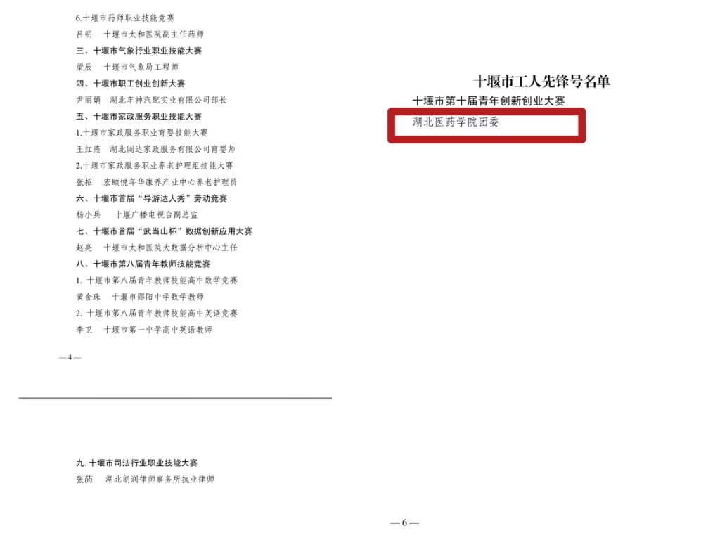 本网讯(通讯员 郭俊)近日,十堰市总工会公布2023年全市劳动和技能竞赛先进集体和先进个人、十堰五一劳动奖和工人先锋号名单,湖北医药学院团委作为唯一优秀集体获得2023年度“十堰市工人先锋号”荣誉。
