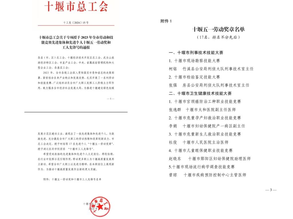 本网讯(通讯员 郭俊)近日,十堰市总工会公布2023年全市劳动和技能竞赛先进集体和先进个人、十堰五一劳动奖和工人先锋号名单,湖北医药学院团委作为唯一优秀集体获得2023年度“十堰市工人先锋号”荣誉。