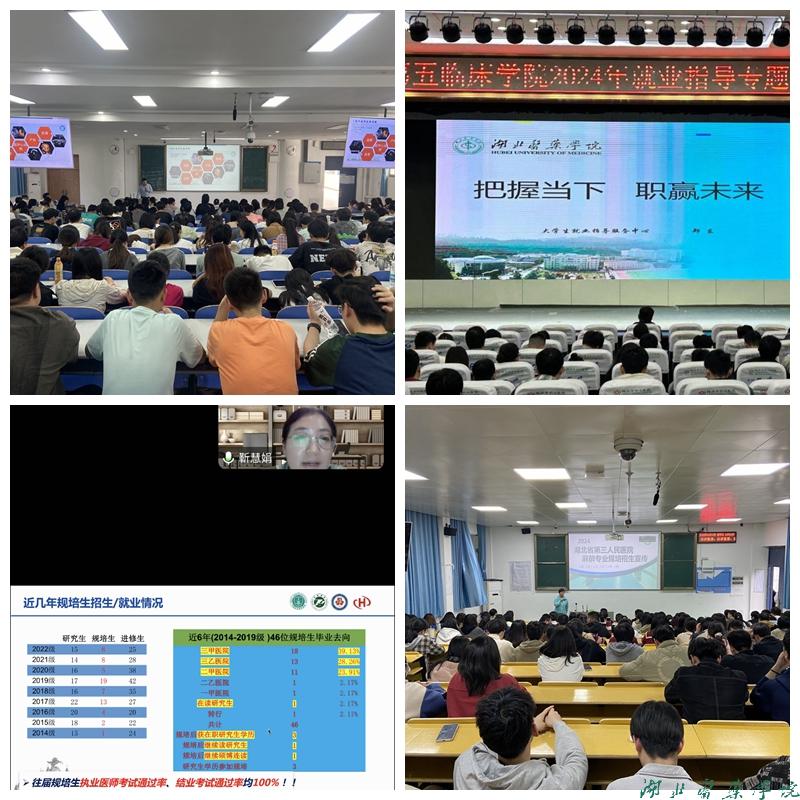面临新形势新政策新变化,学校围绕就业形势政策和住院医师规范化培训等重点领域全力加强就业指导工作。组织工作人员先后赴第六临床学院安康校区、第四临床学院襄阳校区、第五临床学院随州校区等地开展就业指导专题宣教。先后邀请华中科技大学同济医学院附属同济医院、协和医院、湖北省第三人民医院、武汉市中心医院、武汉市第三、第四医院、直属附属太和医院等多家单位组织开展“住培”专题宣教。线上线下累计开展相关主题宣教活动近20场次,着力覆盖毕业生、实习生等重点学生群体。