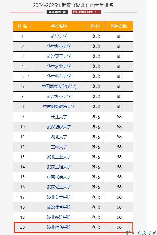 本网讯(通讯员 刘敏)4月30日,全国第三方大学评价机构中国科教评价网(www.nseac.com)正式发布《2024-2025年中国大学本科院校竞争力总排行榜》,湖北医药学院位列全国排名第399位,较2023年上升47位。位列湖北省排名第20位,较2023年上升3位。位列医药类院校排名第41位,较2023年上升5位。