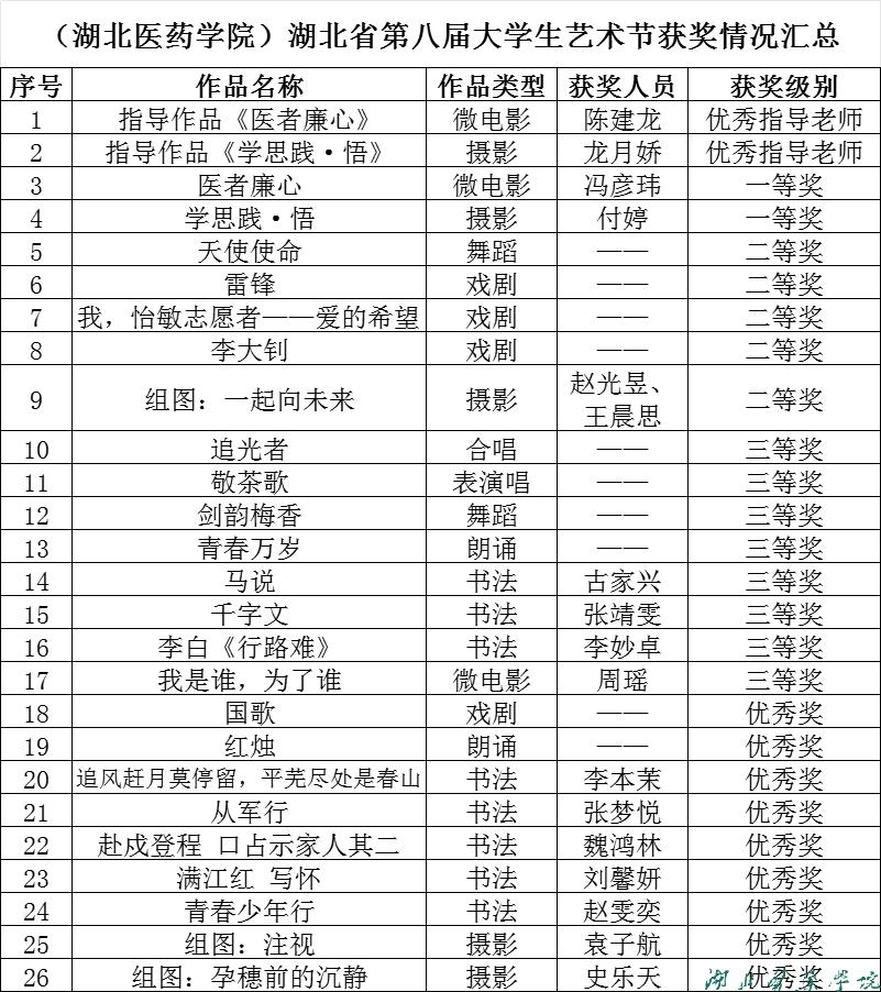 本网讯(通讯员 钟骅 黄坤瑶)近日,湖北省教育厅公布湖北省第八届大学生艺术节评选结果,我校获奖26项。其中,微电影作品《医者廉心》和摄影作品《学思践·悟》获湖北省一等奖,陈建龙、龙月娇获“优秀指导老师”称号。