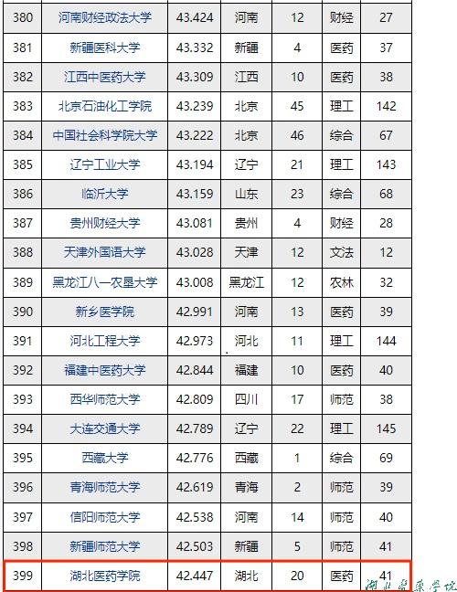 本网讯(通讯员 刘敏)4月30日,全国第三方大学评价机构中国科教评价网(www.nseac.com)正式发布《2024-2025年中国大学本科院校竞争力总排行榜》,湖北医药学院位列全国排名第399位,较2023年上升47位。位列湖北省排名第20位,较2023年上升3位。位列医药类院校排名第41位,较2023年上升5位。