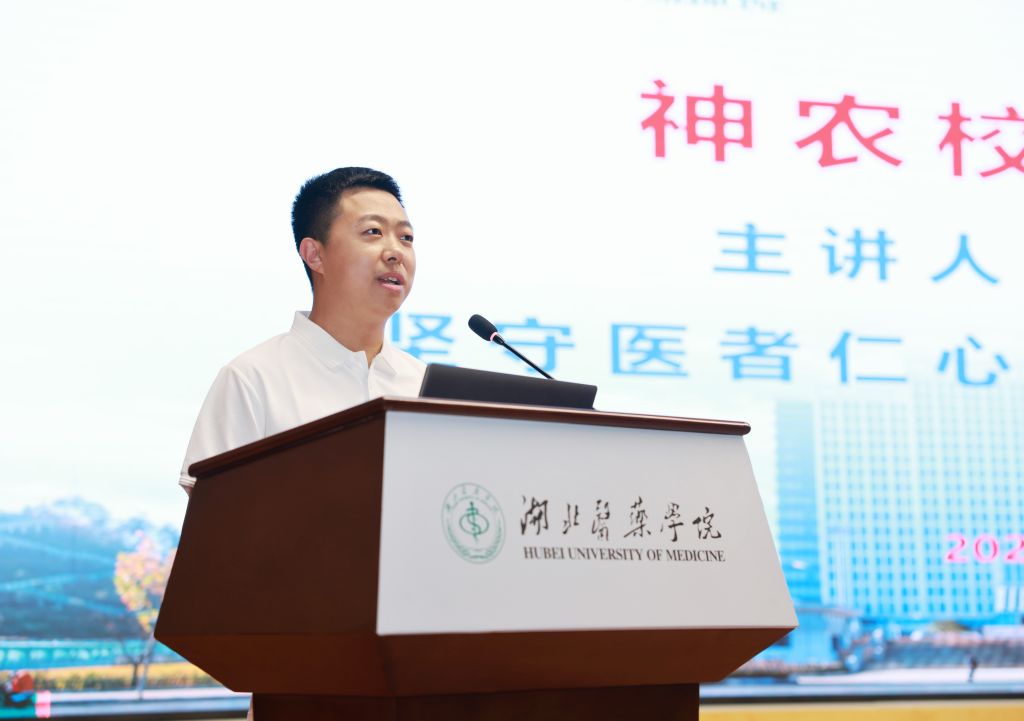 本网讯(文/郑东 肖杉 图/鲍晓宇)5月11日下午,2014级临床医学专业校友、“全国大学生基层就业卓越奖”获得者富雁泽做客“神农校友讲坛”,在学术报告厅为师生校友做题为《坚守医者仁心 扎根基层医疗》的励志讲座。党委书记郑丹凤出席活动为其颁奖并讲话,校友工作与合作发展处、招生就业工作处及各学院师生代表700余人参加活动。