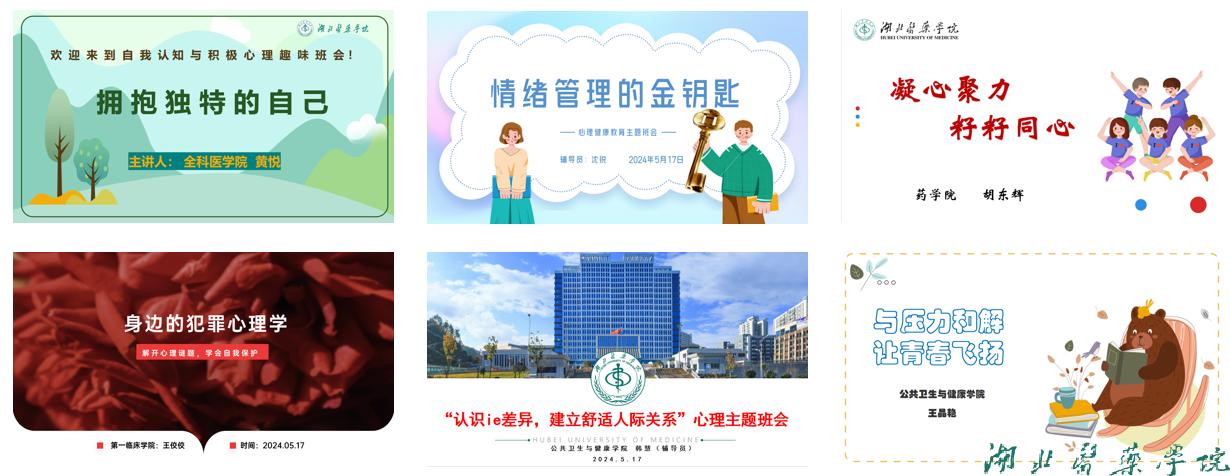 决赛中,全科医学院黄悦、护理学院沈锐、药学院胡东辉、第一临床学院王佼佼、公共卫生与健康学院韩慧和王晶艳分别以《拥抱独特的自己》《情绪管理的金钥匙》《凝心聚力,籽籽同心》《身边的犯罪心理学》《认识ie差异,建立舒适人际关系》和《与压力和解,让青春飞扬》为主题,与所带班级学生一同带来一场场精彩纷呈的心理健康主题班会。