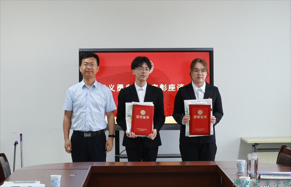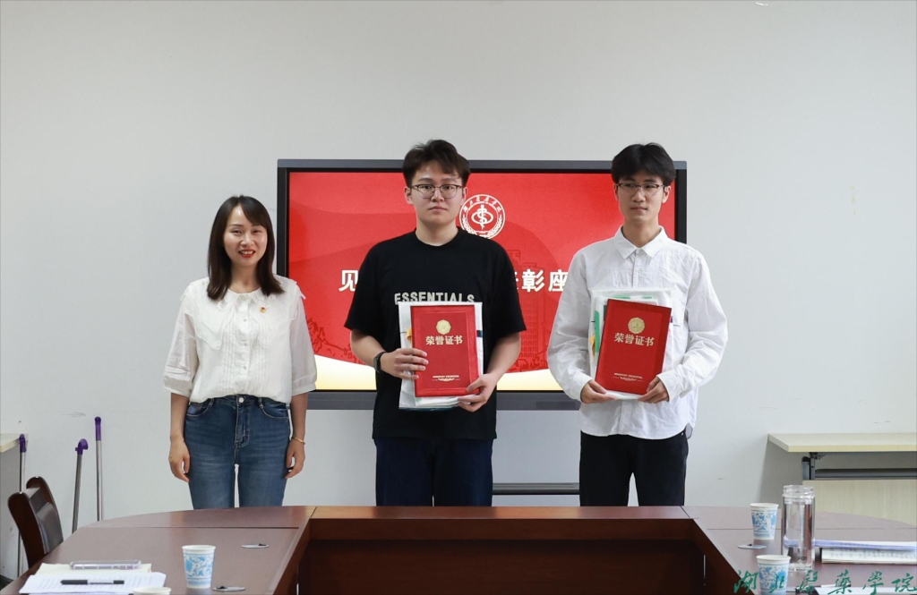 学工部部长陈璞为救人学生陶奕、高康颁发“优秀毕业生”荣誉证书,校团委副书记邱爽为救人学生蒋宇航、王政文颁发“优秀共青团员”荣誉证书,并为四位学生送上由爱心超市杏林文创大学生创业团队提供的精美礼品。
