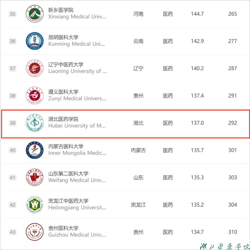 本网讯(通讯员 刘敏)近日,全国第三方大学评价机构软科正式发布《2024中国大学排名》,湖北医药学院位列全国大学排名第292位,较2023年上升10位。位列医药类院校排名第39位,较2023年上升3位。