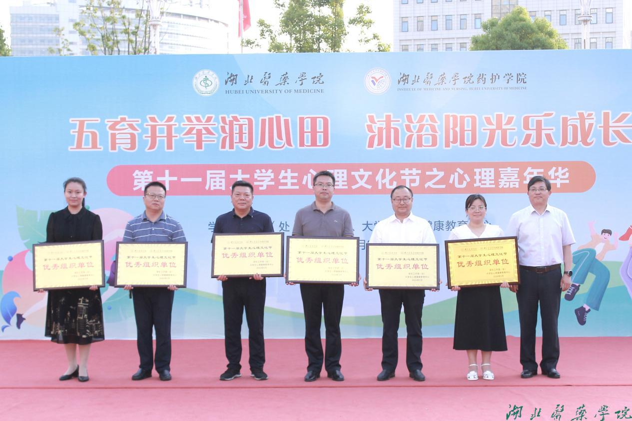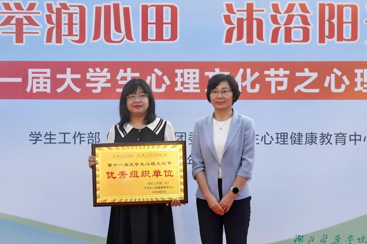 郑丹凤、张海蛟为第十一届大学生心理文化节优秀组织单位颁发奖牌,护理学院、第二临床学院、第五临床学院、公共卫生与健康学院、第三临床学院、生物医学工程学院、口腔医学院等7个学院获此殊荣。