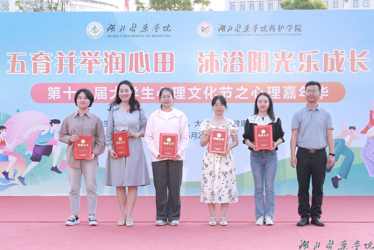 学工部为心理健康主题班会大赛获奖辅导员老师颁发荣誉证书。药学院胡东辉和护理学院沈锐、全科医学院黄悦和公共卫生与健康学院韩慧、公共卫生与健康学院王晶艳和第一临床学院王佼佼获心理健康主题班会大赛一、二、三等奖。