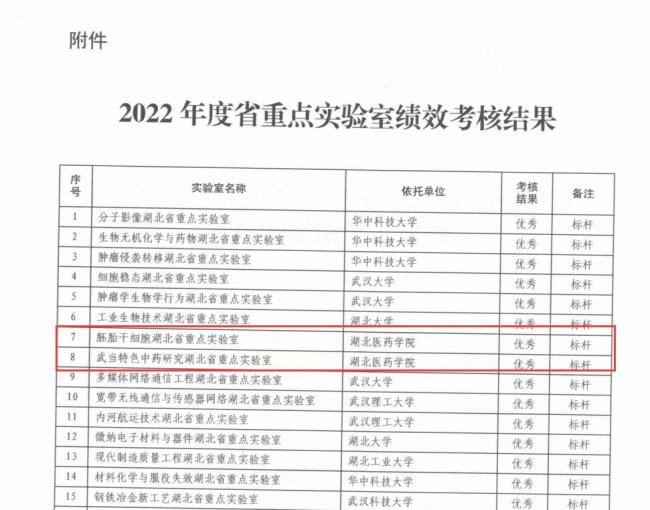 平台建设取得重大突破。凸显“地域特色”优势,立足优势学科,建设高端科研平台。湖北时珍实验室是第10个湖北实验室,湖北医药学院与湖北时珍实验室签署共建协议,拟在老年病临床防治、中药新药与大健康产品等领域,协同开展项目申报和科研攻关。围绕地方生物医药产业,筹建了鄂西北环境与健康产业技术研究院,挂牌成立“一带一路”国际中药材产业科技创新院(十堰分院),武当特色中药研究湖北省重点实验室在科技厅组织的绩效考评中6年蝉联优秀,1次良好,并荣获十堰市“武当人才卡”商务服务优秀平台;胚胎干细胞研究湖北省重点实验室绩效考评获3次优秀、1次良好;2个省重点实验室累计获批绩效考评后补助资金940万元。新增“炎癌恶性转化调控与武当特色中药研究学科创新引智基地”省级科研平台1个,也标志着十堰市省级引智创新示范基地实现“零”的突破。
