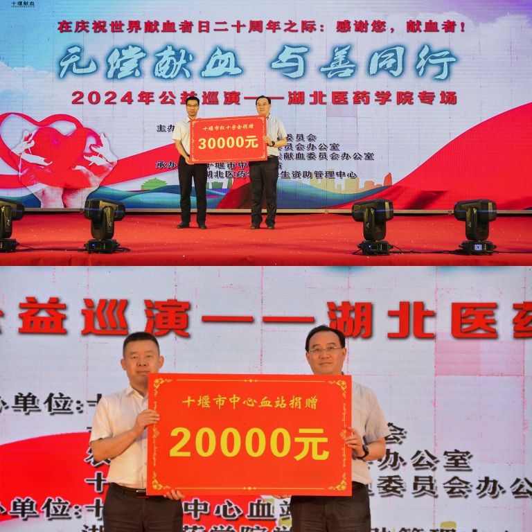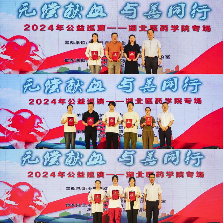 在捐赠仪式环节,十堰市红十字会、十堰市中心血站分别向我校爱心超市捐赠3万元、2万元爱心善款。在颁奖环节,王云甫为3名教师代表颁发“优秀无偿献血个人”证书,池雄为5名大学生颁发“优秀无偿献血个人”证书,詹秀伟为3名捐献造血干细胞加入中华骨髓库的学生代表颁发“捐血献髓奉献奖”证书。