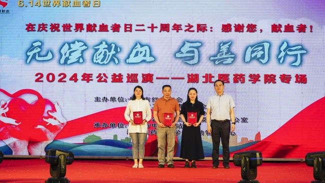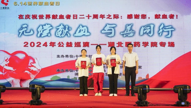 活动现场,十堰市红十字会和十堰市中心血站向湖医药爱心超市暖心捐赠共计五万元;五名学生和三名教师获颁“优秀无偿献血个人”荣誉证书;三名学生因捐献造血干细胞加入中华骨髓库的无私善举获颁“捐血献髓奉献奖”荣誉证书。