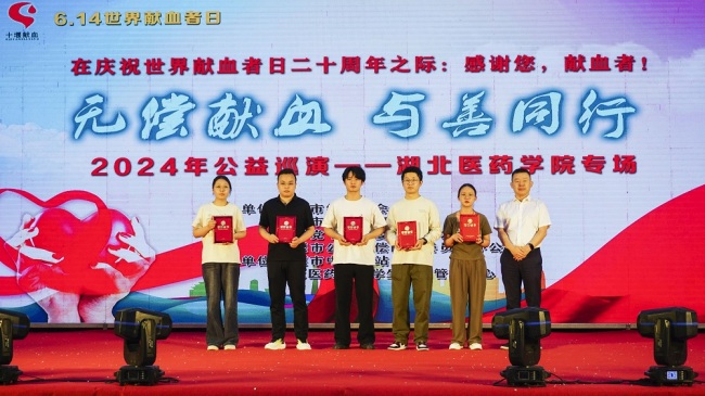 活动现场,十堰市红十字会和十堰市中心血站向湖医药爱心超市暖心捐赠共计五万元;五名学生和三名教师获颁“优秀无偿献血个人”荣誉证书;三名学生因捐献造血干细胞加入中华骨髓库的无私善举获颁“捐血献髓奉献奖”荣誉证书。