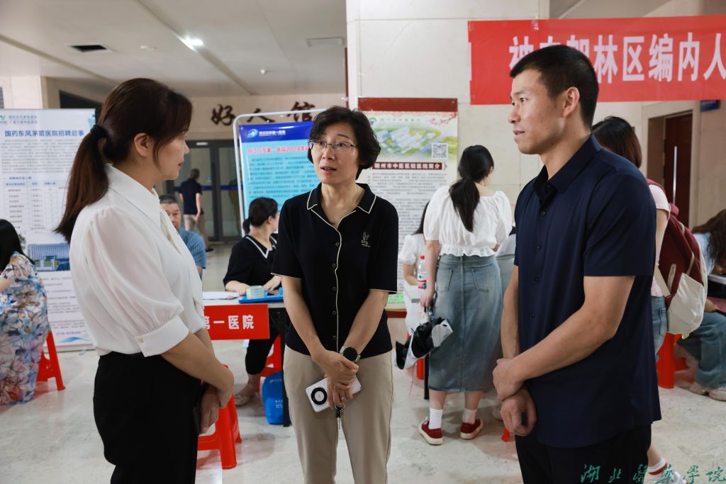 本网讯(通讯员 郑东)6月6日上午,我校在科教楼一楼大厅举行湖北医药学院2024年“百日冲刺”校园招聘会线下专场,校领导郑丹凤、王云甫、严世荣到会场与用人单位交流。