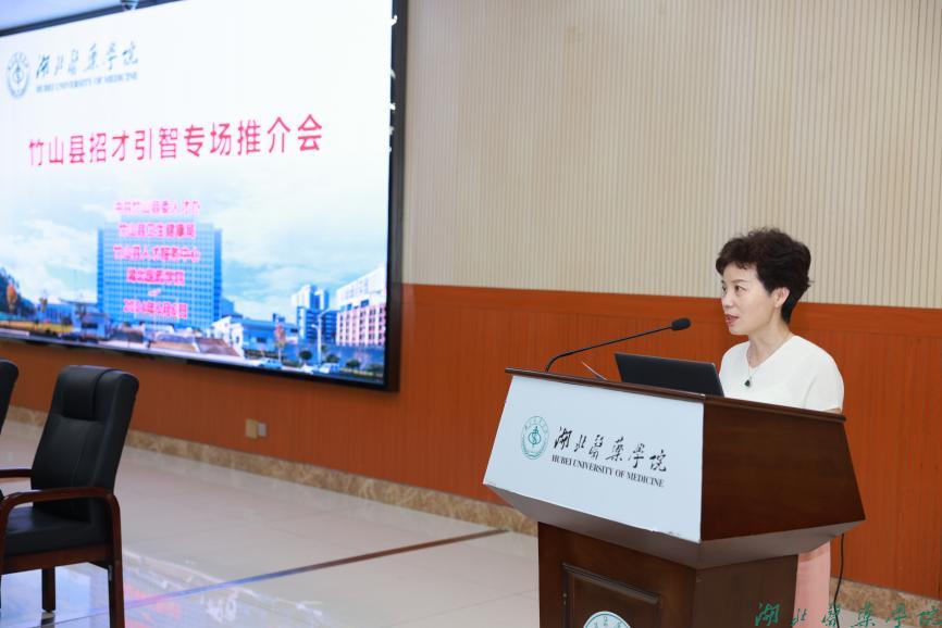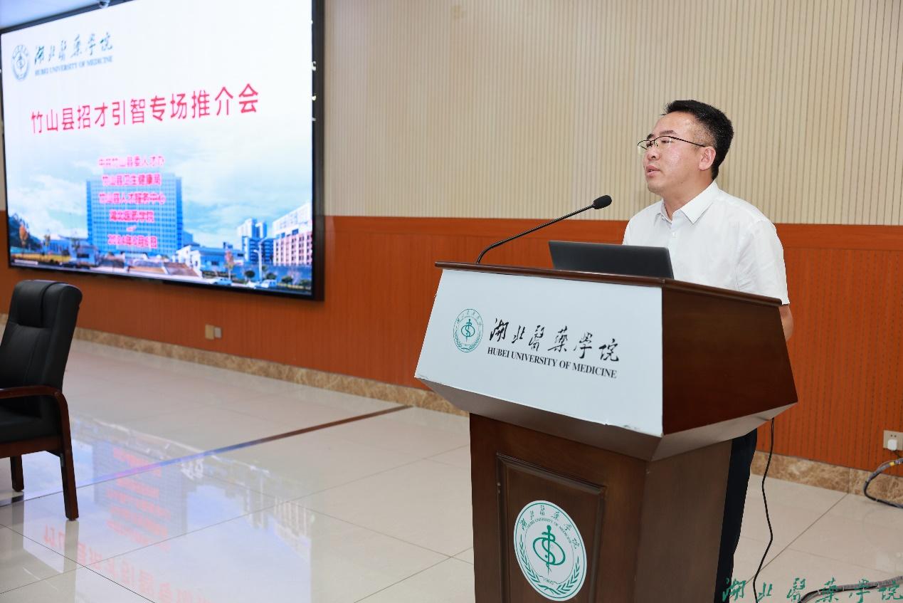 竹山县卫健局党组成员、副局长胡冰向与会人员介绍竹山县医疗卫生事业的发展成果、未来规划和人才需求,以及竹山县招才引智相关优惠政策。我校2016届临床医学专业毕业生、竹山妇幼保健院内科主任刘科显以自己亲身经历和成长感悟讲述竹山县对于人才的重视和培养。竹山县人民医院、妇幼保健院、中医医院等三家单位向与会人员展示单位发展规划及人才招聘计划。