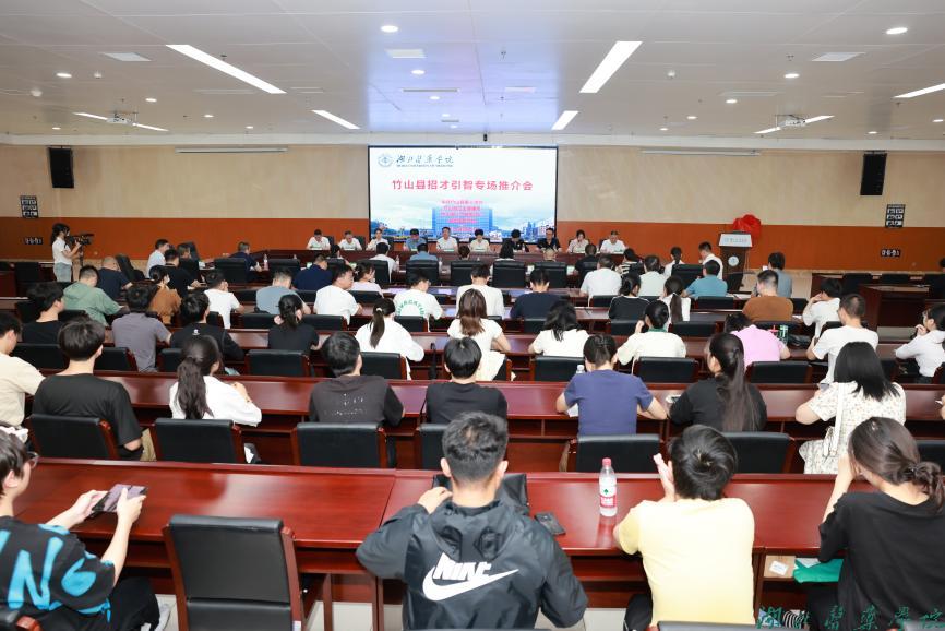 本网讯(文/瞿培林 图/鲍晓宇)6月6日,竹山县人民政府副县长程晓兵带领该县人才办、卫健局及该县人民医院、妇幼保健院、中医医院等单位负责同志来我校开展招才引智专场推介活动。党委常委、副校长严世荣出席活动。招就处及各学院就业工作负责人、毕业班辅导员和150余名2024届毕业生参加活动。