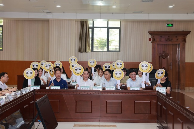 现场播放实地调查视频,师生代表“评议团”以问题为导向,直击问题要害,直抒胸臆。“三个学生社区预约信息如何获取?”“食堂阿姨服务意识有待增强。”“运动场地可否增设储物柜?”大家针对一站式学生社区服务、食堂用餐安全、公共区域安全等问题,畅所欲言,言无不尽。职能部门“答疑团”学工处、团委、后勤管理处、保卫处负责人直面问题,耐心聆听,认真回复,并表态解决办法。对职能部门的答复意见,师生评议团通过举牌真实表达“满意笑脸”与“不满意哭脸”,最终四个职能部门获得了师生评议团的高度认可。