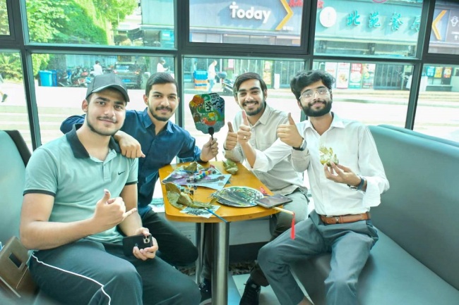 活动开始,同学们通过视频资料,全面学习了端午节文化和传统习俗,了解了端午赠扇的历史故事以及端午香囊的制作过程,并进行端午节文化知识竞赛。随后,中外学生一同用艾叶制作香囊。大家穿针引线、缝布料、系挂绳和流苏、装入艾叶。很快,一个个精美的香囊制作完成。在绘制团扇环节,大家兴趣高涨,慢慢摸索,仔细绘制。手中的团扇经过精雕细琢,华丽变身,一个个花团锦簇、形态各异的团扇呈现在眼前。留学生身着汉服,手拿香囊和团扇拍照留念。