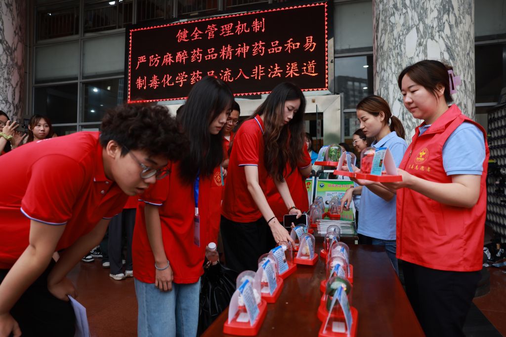 讲座结束,在场人员一同来到该校图书馆前,开展了一堂别开生面的实践教学。图书馆前搭建了一个禁毒科普区,一个个仿真毒品模型赫然在目,真实再现了各种毒品的外观和特征。内容丰富的宣传手册引来不少同学驻足观看,仔细询问。工作人员向同学们派发禁毒宣传手册,结合禁毒模型详细讲解毒品的种类和危害,重点讲解防范新型伪装毒品如“跳跳糖”“奶茶”“上头电子烟”等相关知识,呼吁大家要增强防范意识,共同抵制毒品。