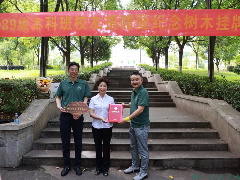 沃土栽培,归巢反哺。在图书馆前校友林,党委常委、副校长严世荣与1989级本科班校友一同参加捐赠暨纪念树木挂牌仪式,校友工作与合作发展处处长陈磊主持仪式。校友代表王配军感恩母校、致敬师长,校友归来回馈母校是责任义务,希望母校越来越好。严世荣介绍学校在基础建设、办学规模、人才培养、专业建设、教学科研和招生就业等方面取得成绩;肯定1989级本科班校友拼搏奋进所取得优异成绩。校友是学校事业发展的重要资源,是母校最生动的靓丽名片,母校也永远是校友们的精神家园和坚强后盾,希望校友们和母校继续同向同行、加强联系,拓展合作渠道,共同开启母校建设发展的新征程。严世荣代表学校接受校友捐赠,并向校友代表颁发捐赠证书及纪念树木铭牌。