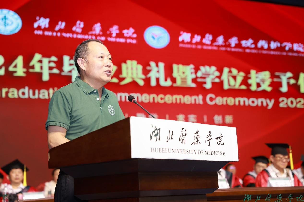 上午八时许,校友们统一身着“湖北医药学院”创意文化衫,齐聚图书馆前合影留念,一同前往学子会馆参加2024届毕业典礼暨学位授予仪式。校友瞿新在毕业典礼上为母校师生倾情献唱《往日时光》,深情回忆在校学习的点点滴滴,尽诉对母校的感恩之情,为在场的师生带来难忘的视听享受;校友张良清在毕业典礼上致辞,他寄语毕业生要谨记母校的烙印:厚德载物、铸就医者仁心,勤奋耕耘、书写人生华章,求实探索、追求医学真理,创新引领、开创医学新篇,祝愿毕业生以厚德为心、以勤奋为翼、以求实为舵、以创新为帆,扬帆远航,驶向医学的星辰大海。