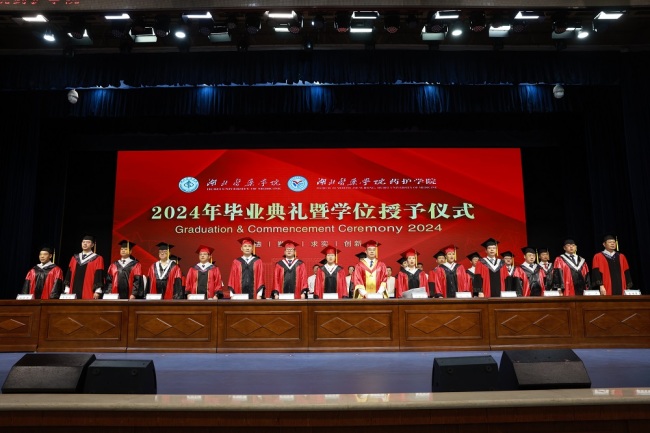 学位授予仪式上,校领导、校学位评定委员会委员为在场毕业生们逐一拨穗,颁发学位证书,并与毕业生合影留念。