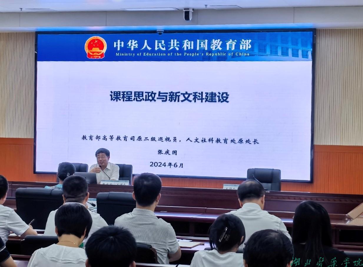 本网讯(通讯员 陈侯安)6月26日下午,教育部高教司原二级巡视员、人文社科教育处原处长张庆国,省教育厅高教处原副处长张永宏一行来校作《课程思政与新文科建设》专题讲座。党委常委、统战部部长谭艳主持,全校无课教师共200余人参加。