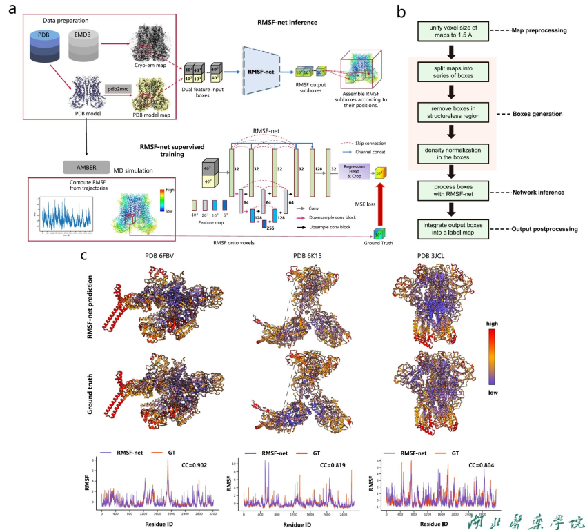 图1 RMSF-net计算流程概览(a,b)和预测结果展示(c) |