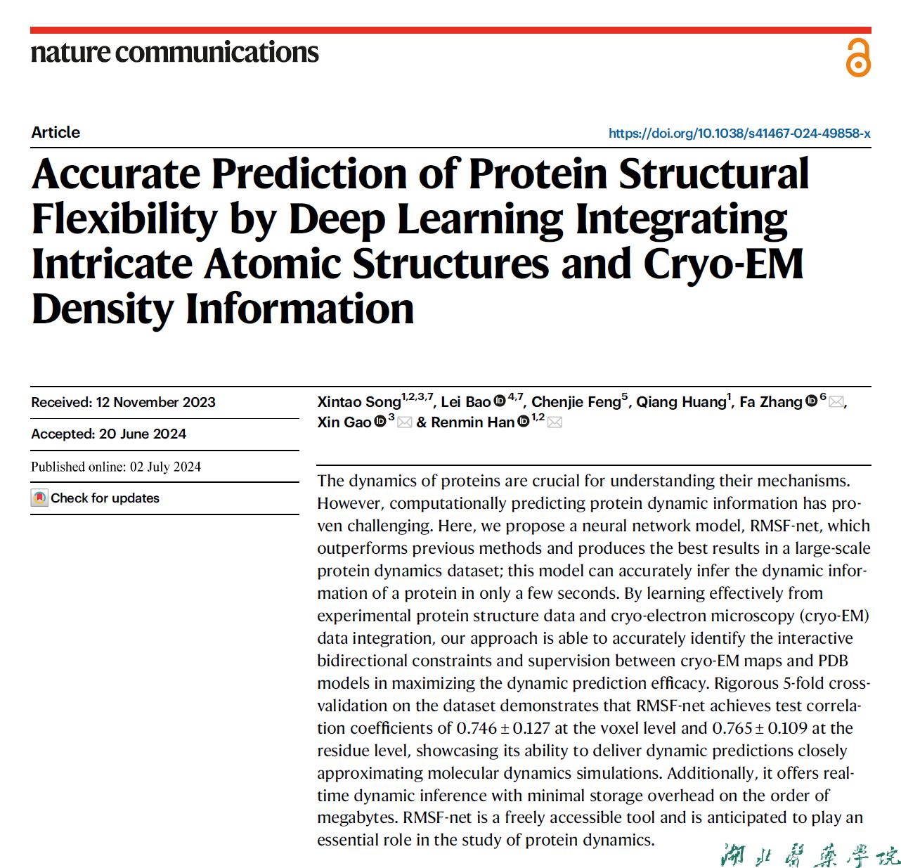 本网讯(通讯员 康文斌 )7月2日,国际顶级期刊《自然通讯》(Nature Communications)(5年IF:16.1)在线刊发公共卫生与健康学院鲍磊博士与多个外单位的合作研究成果“Accurate Prediction of Protein StructuralFlexibility by Deep Learning IntegratingIntricate Atomic Structures and Cryo-EMDensity Information”。鲍磊博士为论文共同第一作者,合作者包括山东大学数学与交叉科学研究中心韩仁敏教授、沙特阿卜杜拉国王科技大学计算生物学中心主任高欣教授和北京理工大学医学技术学院张法教授。