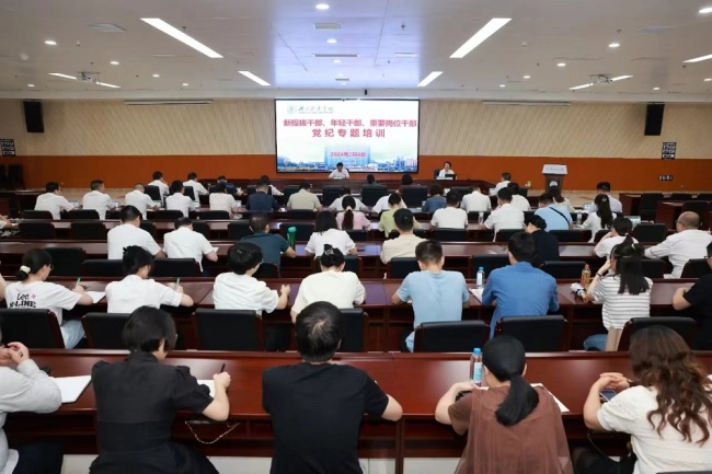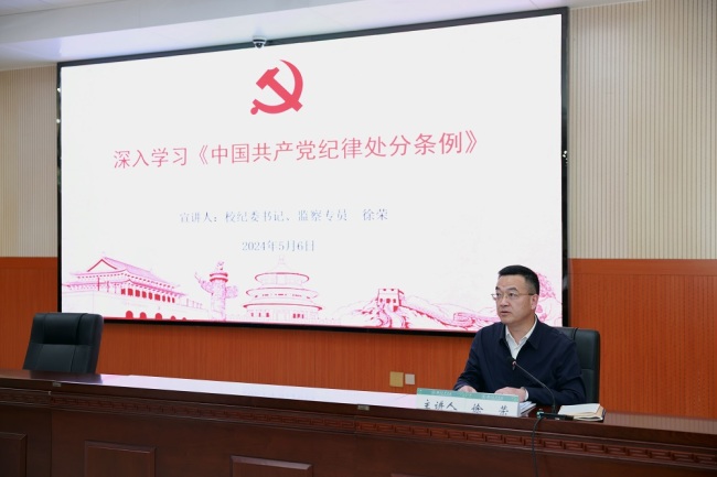 以训学纪,提高学习教育联动性。校纪委组织开展2次集体备课,全体专职纪检干部先学一步、学深一层,确保到所联系二级党委宣讲口径一致、案例精准。5月6日,党委常委、纪委书记、监察专员徐荣作《条例》辅导报告。5月18-19日,校党校在春季预备党员培训班、党员轮训班中安排《条例》专题辅导讲座。6月3日起,组织全校36位学生党支部书记参加教育部举办的学生党支部书记党纪学习教育网络培训班,组织中层干部参加干部在线学习平台党纪学习教育专栏。6月17日、6月20日,分别组织关键岗位干部参加全市、全省关键领域关键岗位干部专题轮训班。