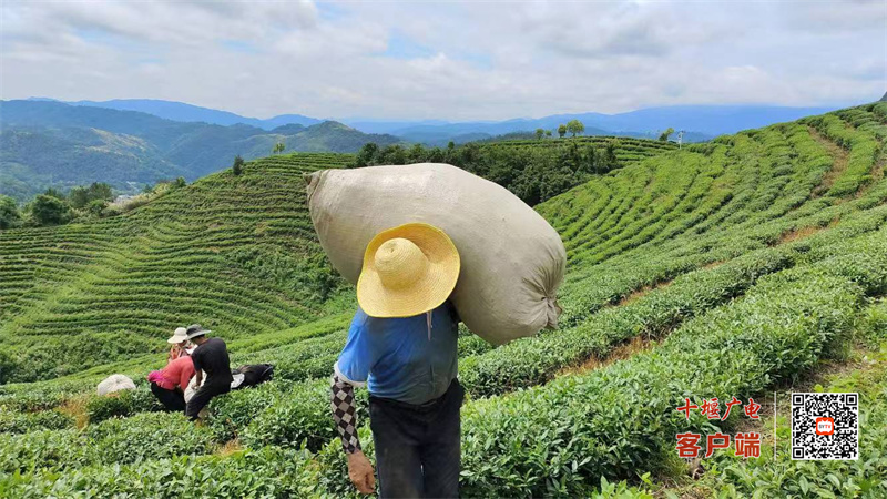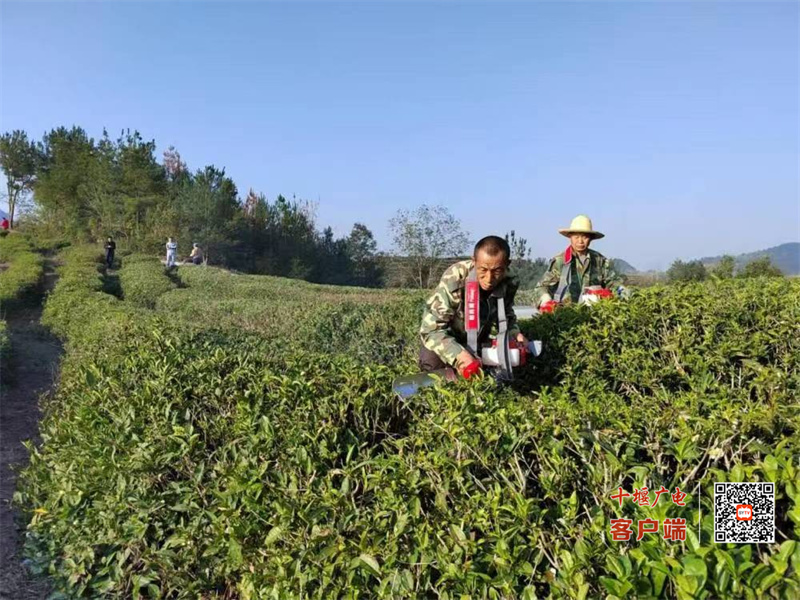十堰广电讯(全媒体记者 白孟尧 通讯员 刘锦华 邓洁)7月18日,记者走进位于竹溪县县河镇县河村的牛角尖茶园,只见云雾缭绕中,一棵棵茶树青翠欲滴,一簇簇嫩芽整齐的挺立在枝头,画面恍如仙境,引人入胜。朝阳还未升起,十来名采茶工人已经开始了一天的忙碌,他们今天要采收大茶。只见他们熟练的操作着手持式的采茶机,伴着机器的轰鸣,一簇簇的茶叶被收割下来,其他工人或装袋、或捆扎、或运送,一派繁忙景象。