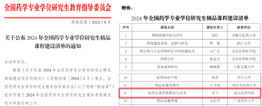 本网讯(通讯员 张艳)近日,全国药学专业学位研究生教育指导委员会公布了2024年全国药学专业学位研究生精品课程建设清单,其中,我校药学院李飞、张艳负责的《医药企业管理理论与实务》课程成功入选。据悉,全国共有57项申报项目被列入精品课程建设清单,湖北省仅华中科技大学和我校两所院校申报的课程入选,是我校研究生课程建设又一项重大突破。
