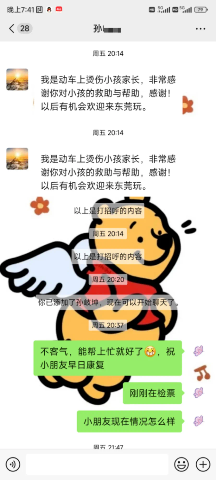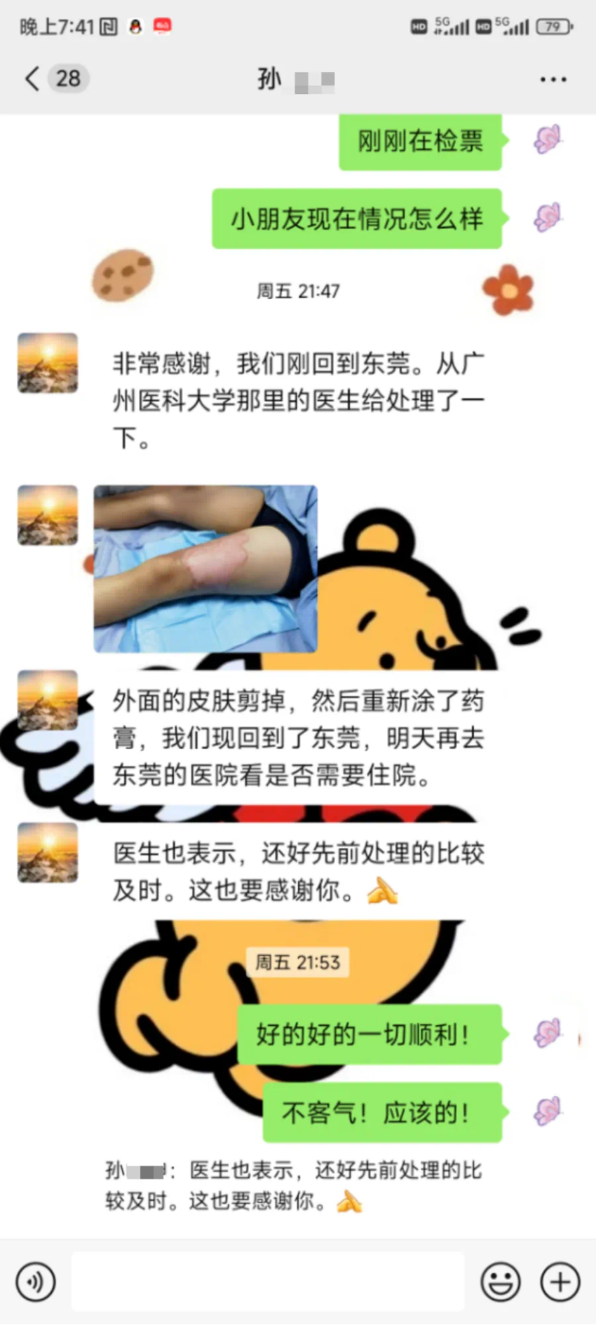 据她回忆,刚赶到车厢时小朋友哭闹着喊疼,家属心里也很内疚并且非常着急,她宽慰家属说自己可以来处理,处理过程中,她一直关心着小朋友的情绪,一边处理一边鼓励小朋友,降温和抹药过程可能会有些疼痛,让他尽量忍一忍。小朋友也很勇敢并且非常配合,这给了陈健萱很大的力量和勇气。在家属的鼓励和信任中,她圆满地帮助小患者度过了这难熬的时刻。