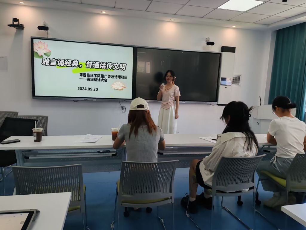 本网讯(通讯员 彭嘉欣)9月20日,第四临床学院在创业孵化基地4楼举办推广普通话活动周之诗词朗诵大会,为全院师生带来了一场精彩纷呈的语言文化盛宴。