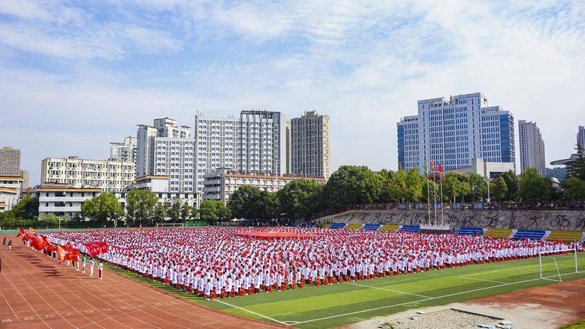 湖北日报客户端讯(通讯员 常靓 陈盈盈 吴浩龙 闫焜翔)“五星红旗迎风飘扬,胜利歌声多么响亮,歌唱我们亲爱的祖国,从今走向繁荣富强……”9月26日上午,湖北医药学院田径运动场上歌声响彻云霄,4000余名本科新生挥动国旗,深情合唱《歌唱祖国》。伴随着嘹亮的歌声,一面长17.28米、宽11.52米的巨幅五星红旗也被数十名新生高高托举。同学们用青春的声音告白祖国,向新中国成立75周年献礼。