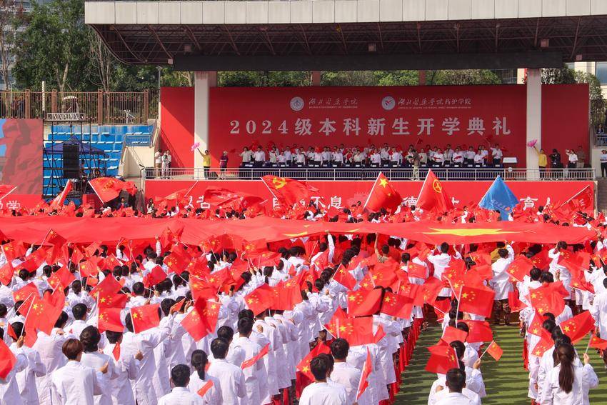 上午9时,湖北医药学院、湖北医药学院药护学院2024级本科新生开学典礼举行。升国旗,唱国歌;升校旗,唱校歌。军训团训练成果展示中,新生组成13个方阵按序入场进行分列式展示,步调齐整划一地通过主席台前接受检阅。擒敌拳一招一式干净利索,战术动作表演气势磅礴。新生们的飒爽英姿在典礼现场“立大志”“明大德”“成大才”“担大任”“有理想”“敢担当”“能吃苦”“肯奋斗”24个醒目大字的映衬下,显得格外动人。生而逢盛世,青年当有为,现场新生齐声高呼:“学医报国,强国有我!青春建功,强国有我!请党放心,强国有我!”